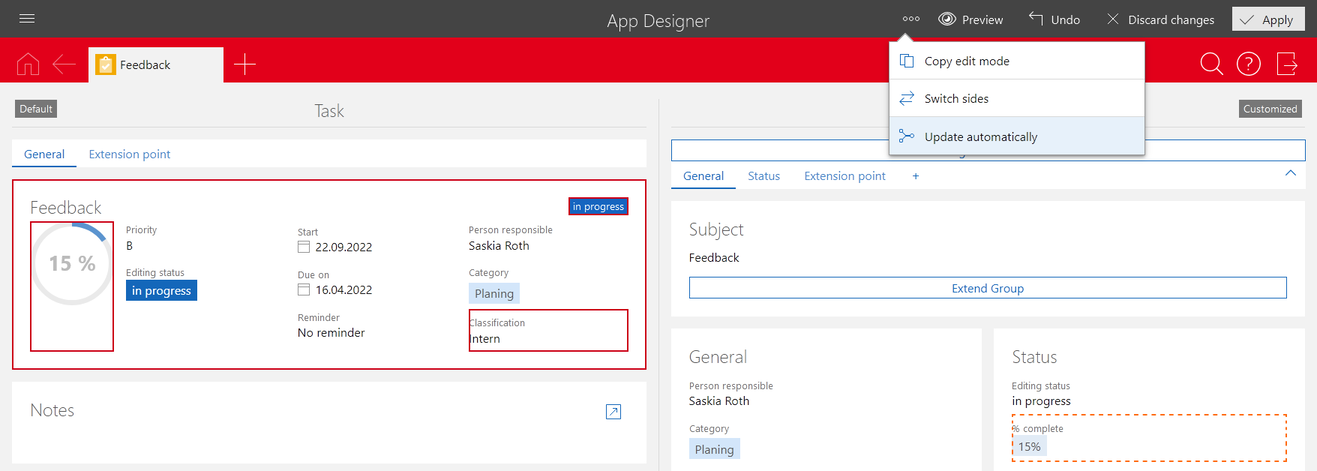 - When you end the App Designer session without publishing your changes, the Update automatically function is displayed again for the respective form after you start the next App Designer session.