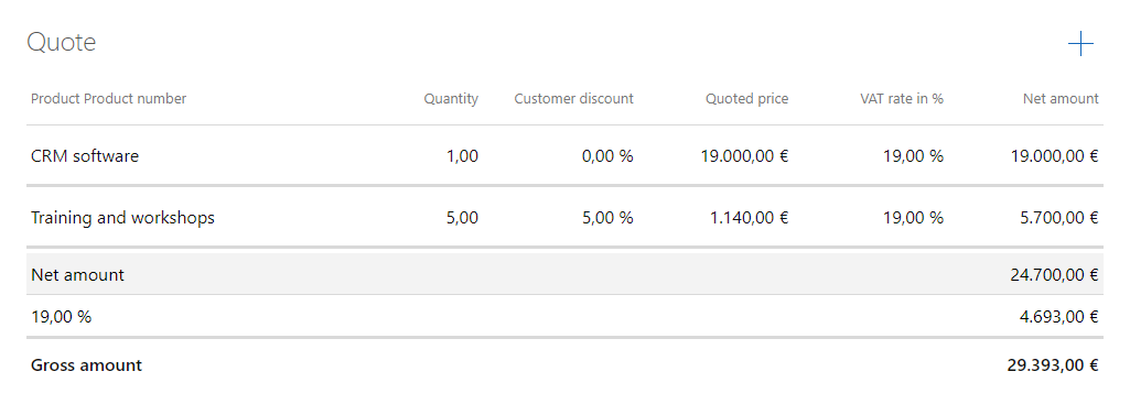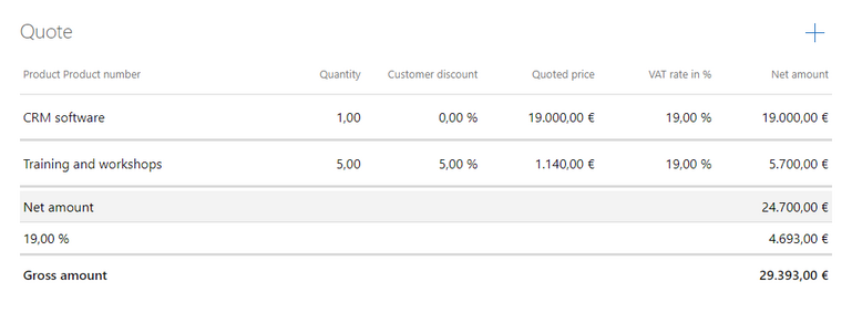 TheExtended Item List usually contains the product items of asales opportunity. The element is preconfigured for sales opportunities and is ready for use immediately after insertion without any further settings. However, you can also customize the settings for sales opportunities according to your requirements.